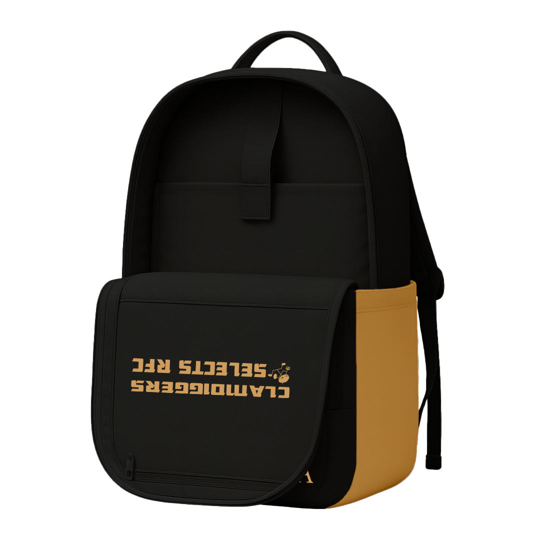 Carry your pride with the Clamdiggers Selects Rugby Club Backpack — a rugged, match-ready pack finished with Clamdiggers gold side pockets, a bold trident on the left shoulder strap, and a “Clamdigger” on the top back spine. Three zippered compartments to keep you neatly organized, while an internal padded sleeve secures laptops up to 16″. Stylish, functional, and built for fans and players who demand performance on and off the pitch.