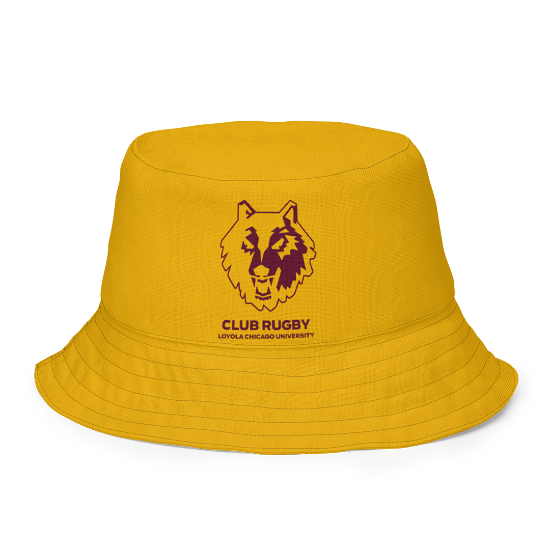 Loyola Chicago Rugby Club Reversible Bucket Hat — flip your look in an instant. The outside shows a bold, eye-catching pattern in Loyola Maroon, Loyola Yellow, and white; flip it for a clean, solid Loyola Yellow interior. Lightweight, packable, and perfect for game days or streetwear, it’s style that switches with the mood.
